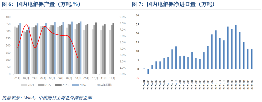 电解铝方面,海外电解铝生产受部分地区山火、爆炸等影响有所缩减,但减量有限。根据最新数据,2024年8-9月全球电解铝产量在580.3万吨,同比增4.2%。出口至中国电解铝产量在25.67万吨,同比增加205%,环比减少8.5%,显性进口量体量一般,但还有隐性进口量作为补充,因此进口量实际远高于公布值。国内电解铝接近产能天花板,月度产量在357万吨,同比增1.33%,年化产能在4348.33万吨,基本持平。再生铝行业是未来发展主方向,现在已经有数百万吨相关项目在海内外逐步落地,但实际投产时间待定。