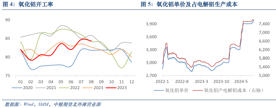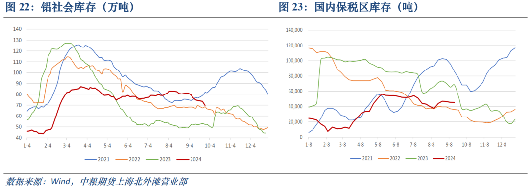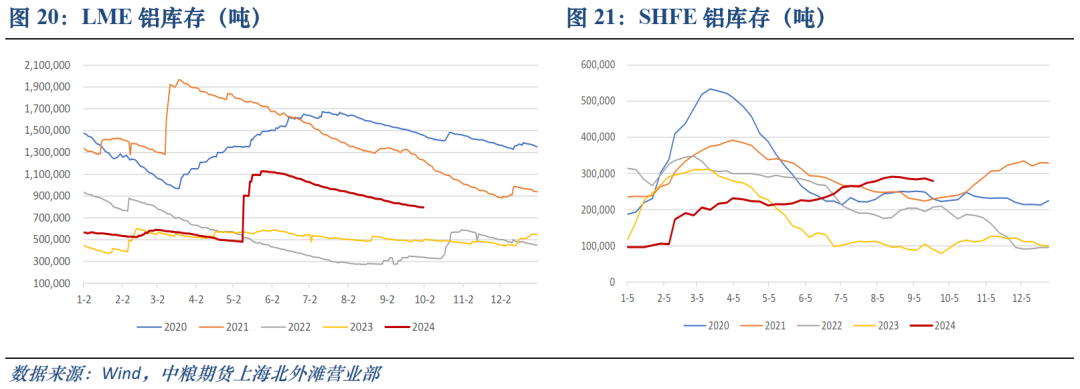 库存端,9月以来市场已经在评估电解铝社会库存拐点的到来,我们原预计9月社会库存基数将下降至75万吨以下,当前社库表现符合预期。社会库存已下降至69.7万吨,提振市场信心。LME亚洲库持续下降,投机资金净多头为主;SHFE库存在经历交割后库存继续流出,显示出经济韧性;保税区库存因内外价格差异,基本持平,但整体处于往年中低位。