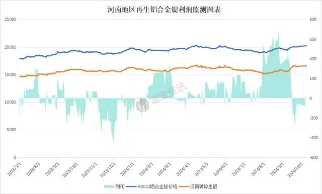 成本以及利润方面:据富宝有色网调研得知,截至10月10日河南地区再生铝合金锭为20200元/吨,较8月底上涨500元/吨;河南破碎生铝价格报16600元/吨,较8月底上涨800元;成本增加主要体现在废铝原料的价格上涨。据富宝了解,虽再生铜行业有783号文政策的或将延后执行的消息,但目前来看再生铝行业基本已经明确,多地企业均反馈税负成本增加,又反向票问题仍未得到较好的解决。据最新数据显示,河南地区再生铝合金锭利润转为负值,较8月底下降超400元/吨。
