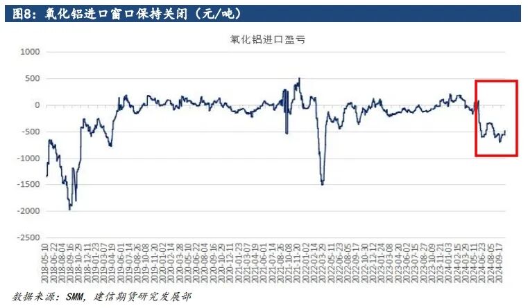今年三月份,海外陆续开始减产。其中美铝一季度开始陆续减产220万吨的冶炼厂;力拓3月短暂减产后恢复,但5月再度临时减产约100万吨生产线,导致海外供应开始偏紧;印度Nalcol在4月份事故中减产约50万吨生产线;虽然印度Vedanta在4月成功投产150万吨生产线,但从二季度公布产量数据显示其投产并未达到理想效果。一系列减产最终导致从4月份开始我国氧化铝进口窗口逐渐收窄至彻底关闭,我国也从氧化铝净进口国转为净出口国。根据海关总署数据显示,2024年8月我国氧化铝净出口13.70万吨,1-8月累计净进口16.14万吨,考虑到我们对俄铝的刚需出口,预计在海外冶炼厂复产之前将保持净出口状态。