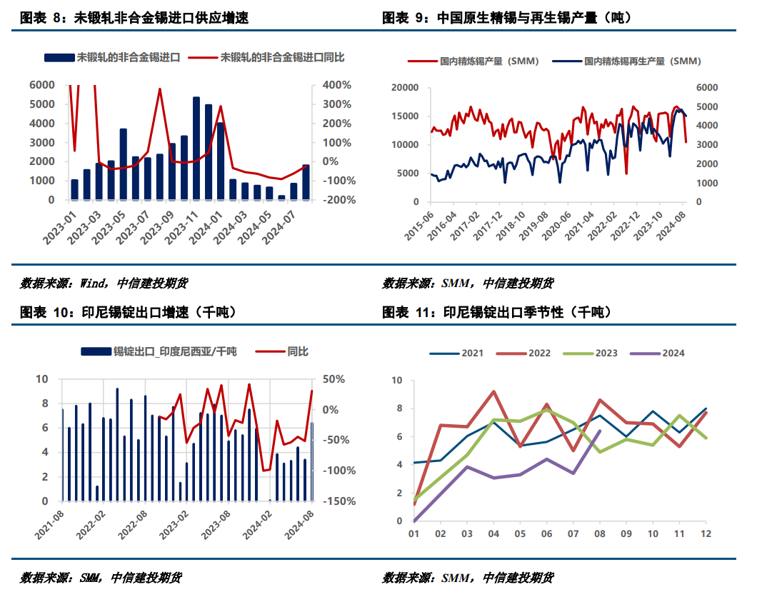 冶炼端,三季度国内锡锭供应季节性回落,预计四季度矿紧张将真正传导至冶炼环节。8月缅矿进口减少,再生锡原料不足,西南部分冶炼小厂自有库存接近耗尽,选择减少排产甚至开启年度检修停产。9月,随着检修陆续结束,锡精矿加工费止跌企稳,不过结合上文对原料紧张格局难改的判断,预计后续锡锭产量增速仍不乐观。此外,未锻轧的非合金锡进口增速延续负增长,尤其来自印尼锡锭出口恢复不及预期,9月进量由6400吨下滑至5000吨,远远低于过去3年月均6000吨的水平。