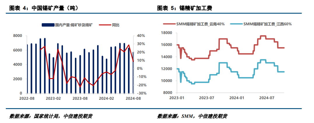 原料端,三季度国内原料紧张、进口萎缩,预计四季度供应短缺仍将延续。8月国内锡矿产量5680吨,环比减少9.2%,同比增幅收窄至8.7%;同时因缅矿迟迟未复产+陆运中断、非洲锡矿产量不及预期,8月中国锡矿进口仅8825吨,环比大降41%,同比减少67%。