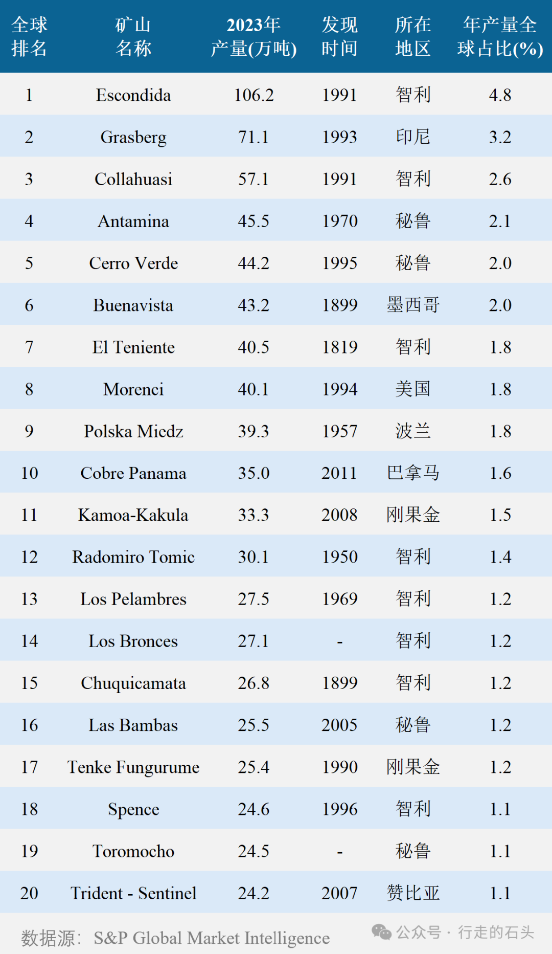 主力矿山是维持大宗金属供应的核心动力,在很大程度上影响整体表现。如下图所示,2023年排名前20的矿山,贡献了全球矿产铜年产量的36%;其中超过70%都是在30年之前发现的。