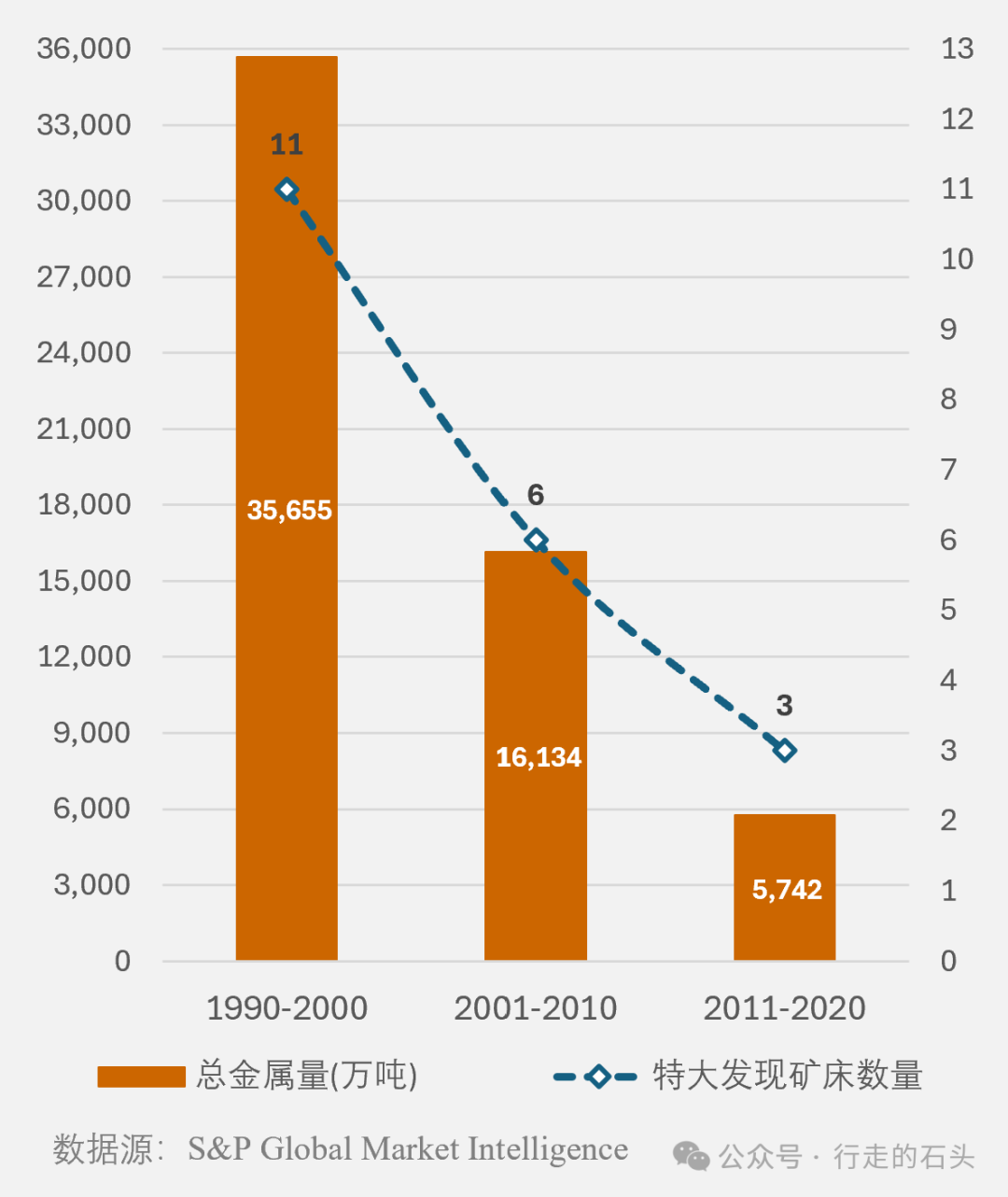 如果我们以10年窗口期来分析,特大铜矿找矿发现的骤降趋势令人触目惊心。