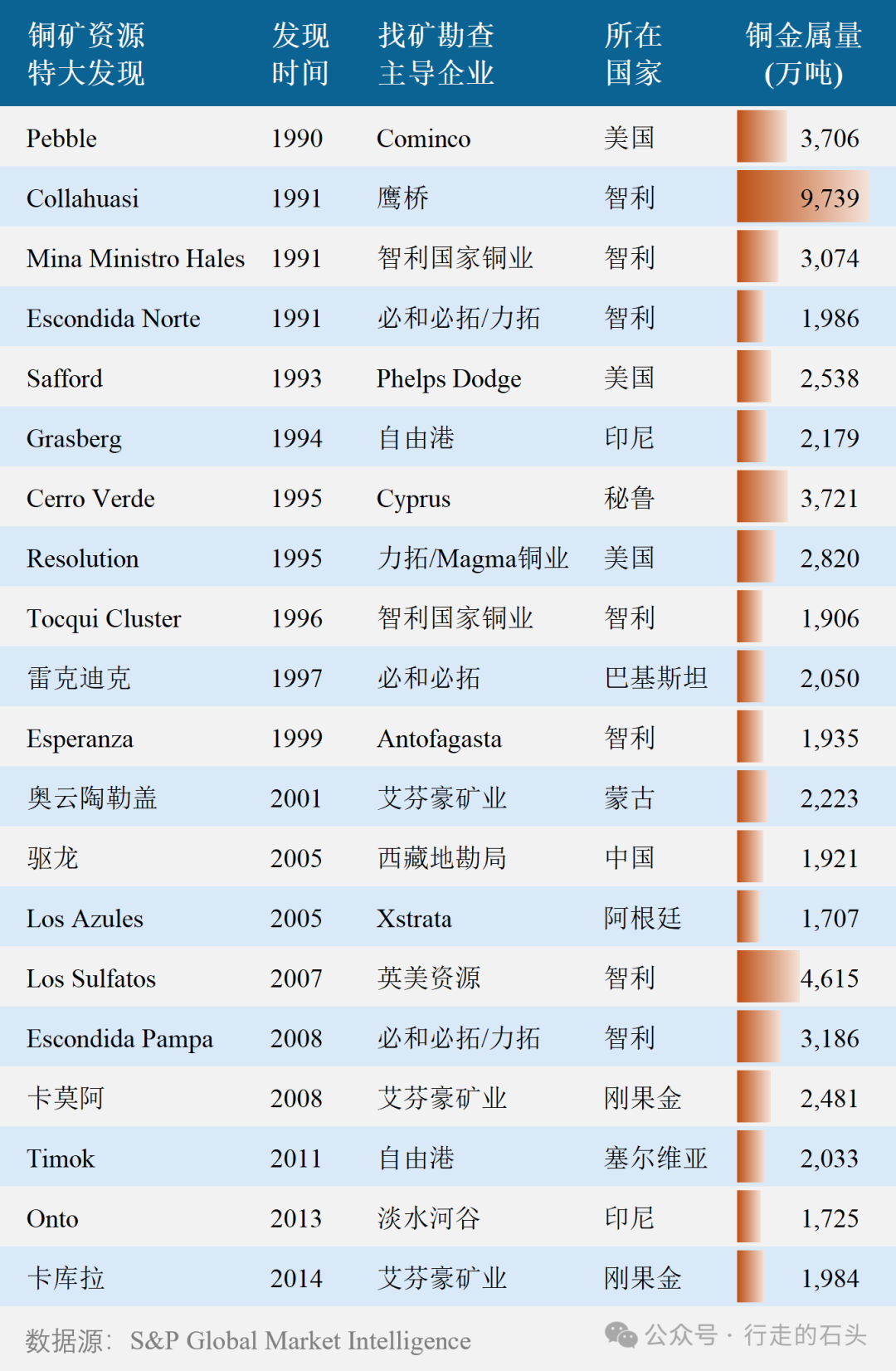 标普将首次识别出具有潜在经济矿化的钻探年度定义为发现年,将其资源量和/或储量、以及过去产量的总和作为总金属量标准来统计铜矿找矿发现。特大铜矿找矿发现,是指矿床铜资源金属量超过1000万吨的新项目。