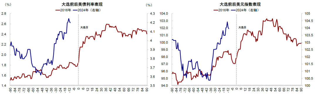图表:本轮特朗普交易相较于2016 前置明显,美债利率和美元在大选前已经明显抬升