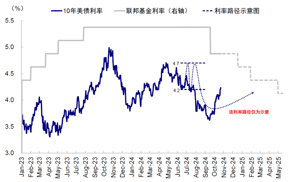 美债:若大选后冲高或带来短期交易性机会。近期利率的大幅上行,一是纠正之前过于透支的衰退和降息预期,二是被特朗普交易所强化。前者使得利率下行的大方向可能已经结束,但后者却可能使得利率短期冲高过多而透支,尤其是后续政策推进没那么顺畅,甚至受阻的时候。因此方向大体已定,很难再突破前期低点,但仍有交易性机会,尤其是大选后如果再度冲高。我们测算的美债合理中枢为3.8-4%。