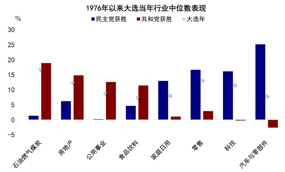 图表:民主党获胜时,汽车、科技行业表现亮眼;共和党获胜时传统能源、地产相对跑