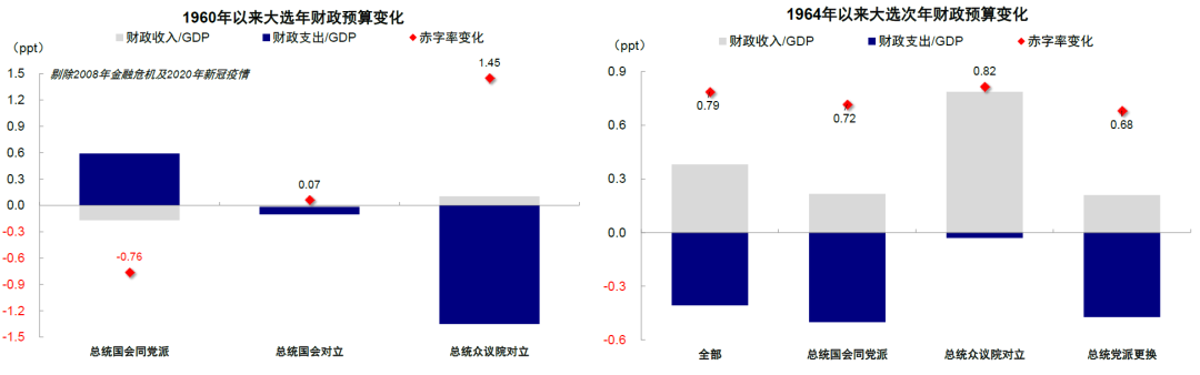 图表:财政力度取决于大选年党派分布,国会与总统对立时大选当年财政往往收缩,大选次年由于新政策并未完全落地,财政绝大多数情况也在收缩