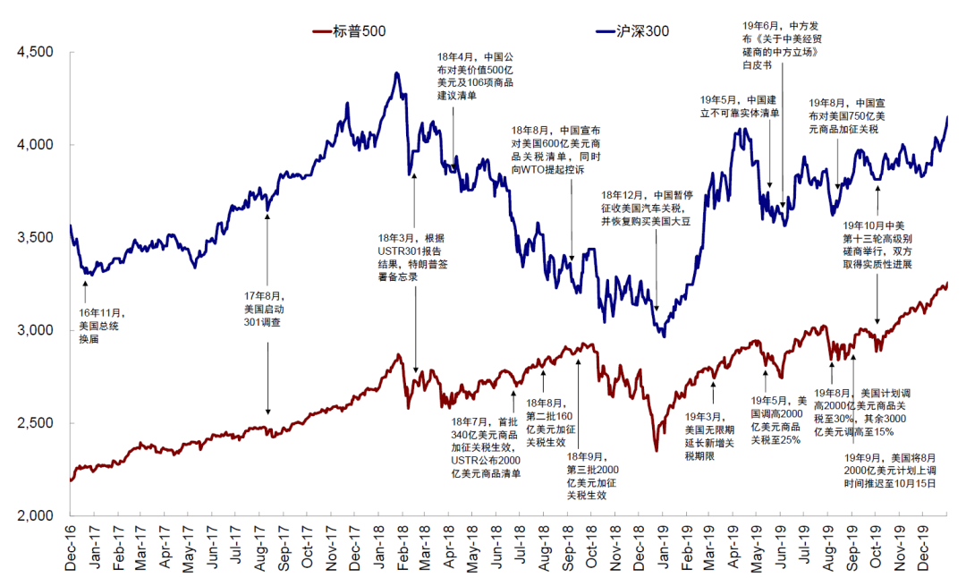图表:2017年启动301调查时,中国股市依然延续上涨。2018年一季度末加关税政策正式开始实施,叠加国内金融去杠杆,A股转为下跌