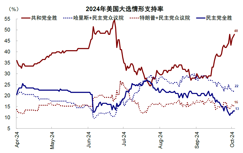 美股:短期或有扰动,但长期不悲观。当前美股较高的估值、三季度业绩、美国大选的政策变数都不排除带来扰动,但在当前美国财政发力、AI产业趋势以及全球资金再配置的三大宏观支柱未发生改变的背景下,美股长期并不悲观。“共和党全胜”表现更好,盈利受益于减税政策的提振,结构上偏向周期股。风险在于出现博彩胜率较小的特朗普+民主党国会或者“民主党全胜”。