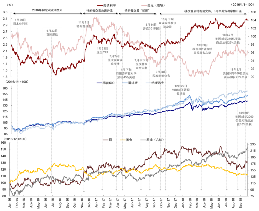 2016年大选前后的资产表现:“意外”获胜触发特朗普交易,政策受阻后暂缓,税改成功后重启;2018年贸易摩擦