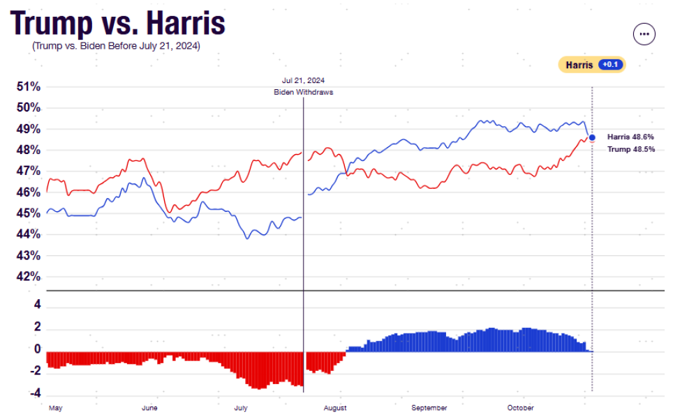 图表:特朗普在民调支持率上已经基本追平哈里斯(截至10月26日)