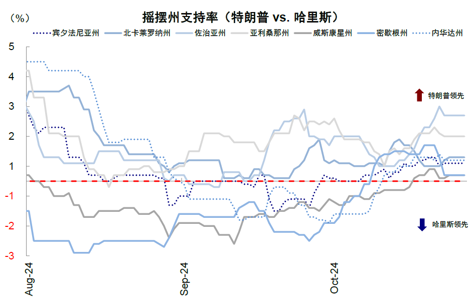图表:特朗普在摇摆州的领先优势也进一步扩大(截至10月26日)