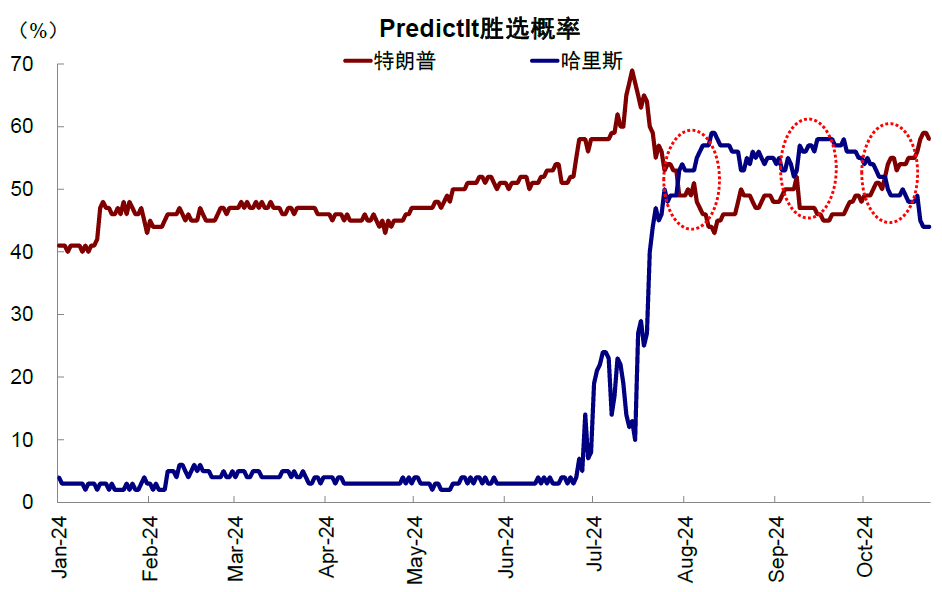 距离11月5日美国2024年大选日已不足10天,市场对特朗普胜选的预期持续上升。选情方面,特朗普不仅在博彩赔率和摇摆州民调的优势进一步扩大,甚至在一般民调支持率上也已经追平哈里斯,进而强化了“特朗普交易”,促使海外资产在过去一段时间呈现美债利率、美元、黄金以及美股同涨这一看似“矛盾”的现象。