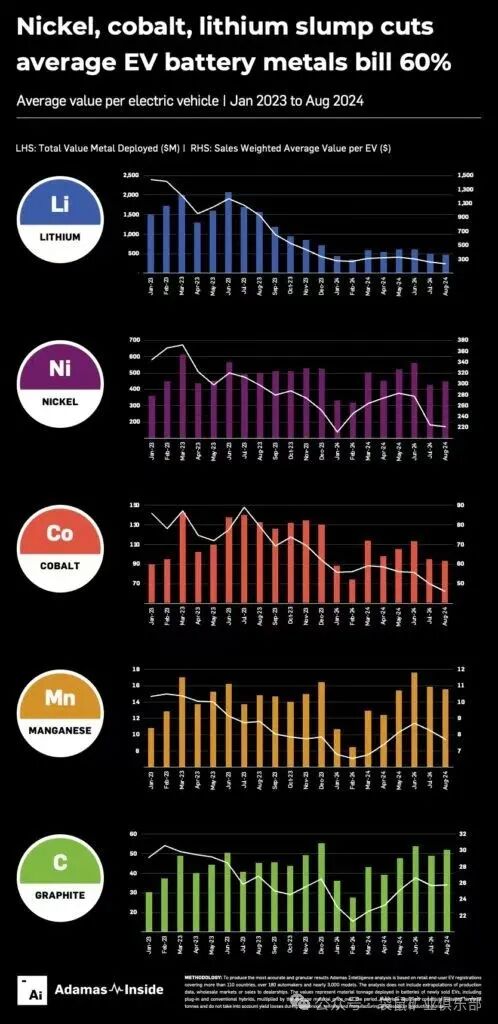 锂的销量加权平均值在过去一年里下降了75%,降至236美元;钴的销量加权平均值略高于46美元,比2023年8月的水平低42%。锰是今年唯一出现正增长的电池原材料,增长了 3%,但与去年同期相比也下降了 8%。在负极材料方面,石墨的装载量和价值基本保持稳定,平均每辆电动汽车略低于 26 美元。