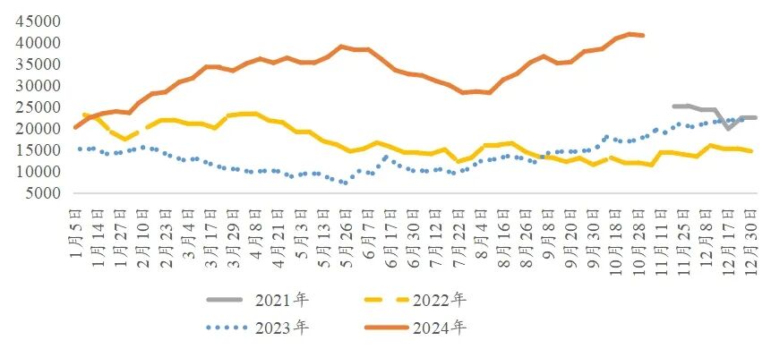 从2023年8月开始,印尼镍矿RKAB审批进度相关消息反反复复,多次扰动镍价。据钢联数据,2024年度印尼镍矿需求量预估为2.39亿湿吨左右,截至10月14日,印尼能矿部已通过2024年度镍矿审批额度为2.75亿湿吨,名义上看已经超过当年需求,但在矿山开采能力、运输能力、天气干扰等因素的制约下,实际镍矿供应量约为配额量的85%,即2.34亿湿吨左右。