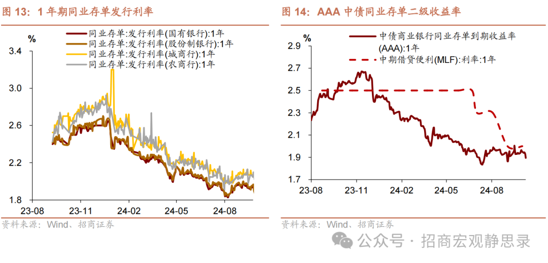 1.9%、1.9%。各主体发行利率分化,股份行、国有行、城商行、农商行 1Y 同业存单发行利率分别变动-2.4BP、-1BP、-3.1BP、0BP 至 1.9%、1.9%、2.1%、2.1%。