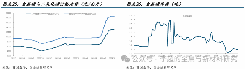 锡锭上周价格为25.63万元/吨,环比上涨0.66%;锡锭上周库存为8522吨,环比下降1.33%。近期佤邦工矿局发布通知,禁止停产期间偷挖乱采;10月中旬佤邦发布矿山缴费通知,综合考虑推进流程和佤邦锡矿资源水平,我们认为缅甸锡矿复产进度或不及预期,复产达到的供给高度未必能达到停产前水平。海外半导体被动去库接近尾声,有望进入主动补库阶段,有望对锡需求产生正面影响。在库存快速去化和需求逐步回升的大背景下,即便复产也未必对价格带来显著冲击,价格重心抬升趋势不改。中长期看国内外增量项目较为稀散且仍存在较大不确定性,需求端有望受益AI赋能下、汽车智能化加持的半导体复苏和光伏景气高增,锡供需格局将长期向好。建议关注锡业股份、华锡有色、兴业银锡。