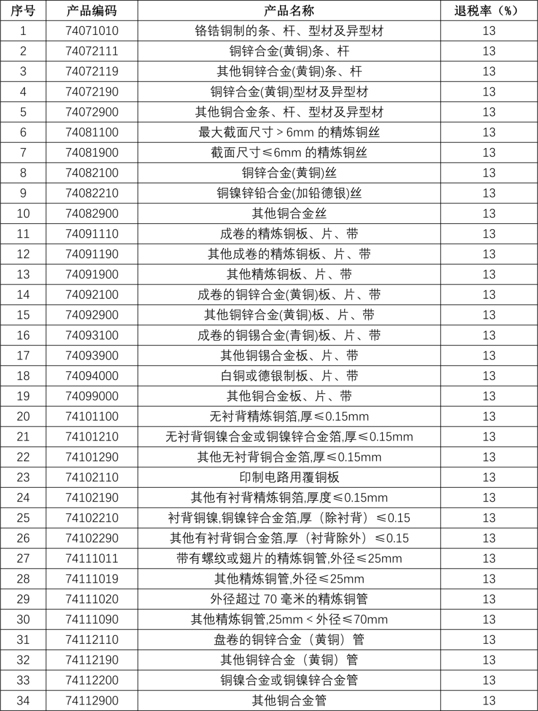 根据附件1所列取消出口退税的产品清单,涉及铜条杆、铜丝、铜板带、铜箔、铜管等大类的34个铜材产品。