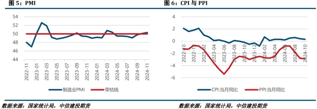 随着一系列存量政策和增量政策持续协同发力,11月份制造业采购经理指数为50.3%,比上月上升0.2个百分点;非制造业商务活动指数为50.0%,比上月下降0.2个百分点;综合PMI产出指数为50.8%,与上月持平,我国经济景气水平总体保持稳定扩张。此外,国家统计局发布数据显示, 10月份规模以上工业企业利润同比下降10%,降幅较9月份大幅收窄17.1个百分点,41个工业大类行业中,27个行业盈利较上月好转。