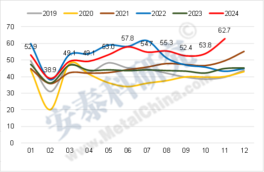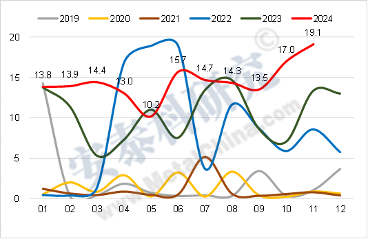 1-11月,我国累计出口铝制品297.1万吨,同比增长15.0%,增幅比1-10月下降0.7个百分点。其中,向美国累计出口49.1万吨,同比增长18.2%;向澳大利亚累计出口16.3万吨,同比增长10.4%。预计2024年我国铝制品出口创下历史新高,达到325万吨。