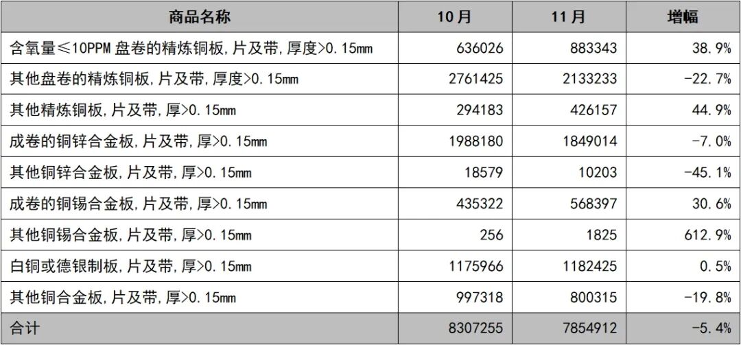 进口方面,11月,我国铜板带进口量为7855吨,同比下降5.2%,环比下降5.4%,进口金额为9477万美元,同比下降2.5%,环比下降4.9%。1—11月,我国铜板带进口量为8.09万吨,同比增长15.3%,进口金额为9.71亿美元,同比增长17.2%。