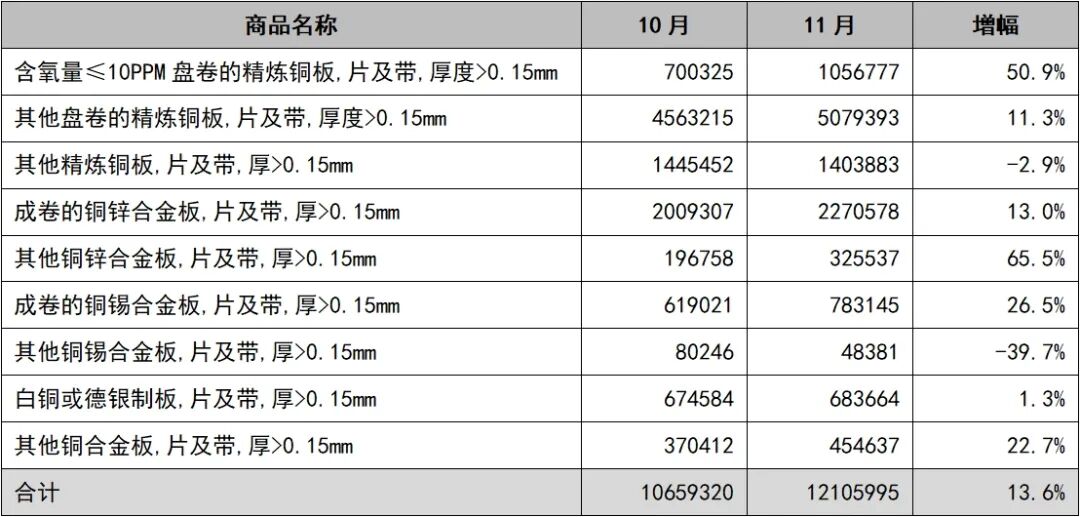 国家取消出口退税的新政将于12月1日开始执行,从11月的数据来看,一般贸易方式出口的铜板带产品维持在74%,与1—10月数据基本持平,预计12月一般贸易方式对我国铜板带出口产生影响。