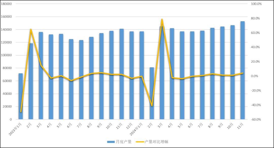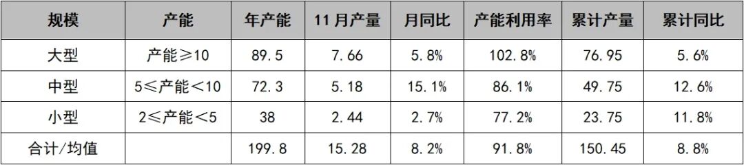 分企业规模来看,大型企业11月完成产量为7.66万吨,同比增长5.8%,产能利用率为102.8%,环比增加2.6个百分点,1—11月累计完成产量76.95万吨,同比增长5.6%;中型企业完成产量为5.18万吨,同比增长15.1%,产能利用率为86.1%,环比增长5.6个百分点,1—11月累计完成49.75万吨,同比增长12.6%;小型企业完成产量2.44万吨,同比增长2.7%,产能利用率为77.2%,环比增长3.3个百分点,1—11月累计完成23.75万吨,同比增长11.8%。