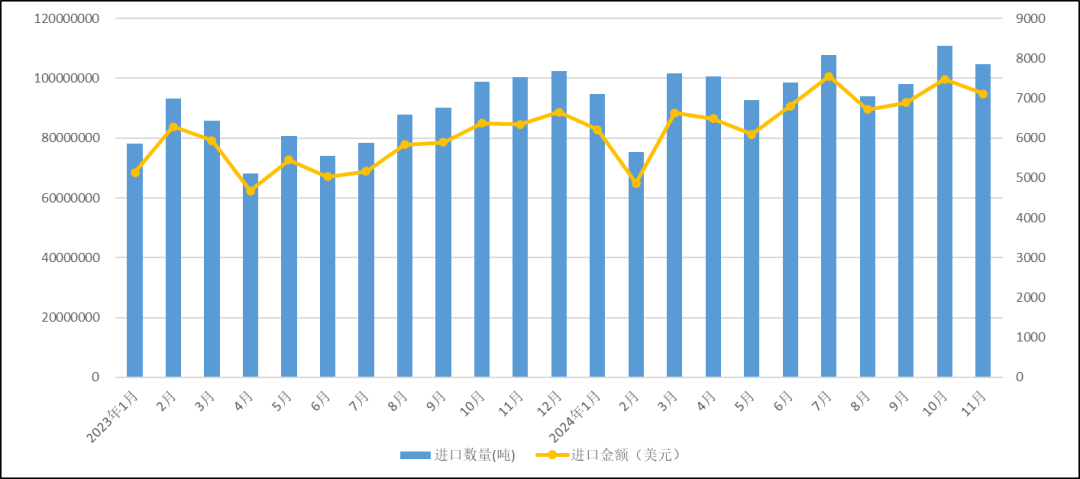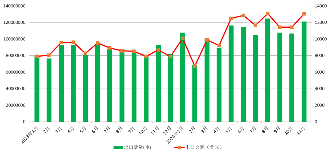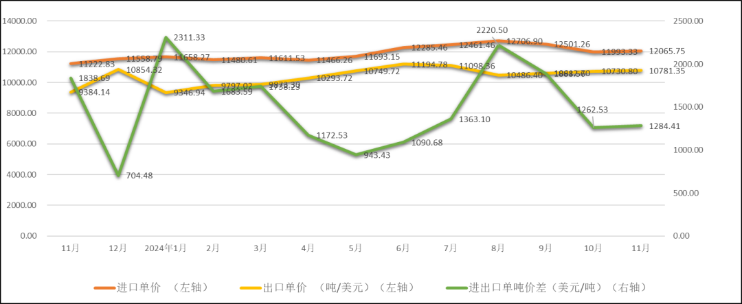 从进出口产品的价格方面看,11月我国产品出口平均单价为10781.35美元/吨,进口产品单价为12065.75美元/吨,进出口产品单价价差为1284.41美元/吨,较上月小幅增加21.88美元/吨,价差企稳持平。