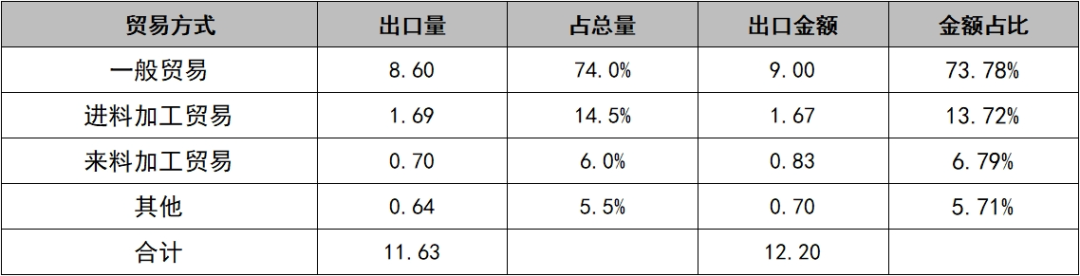 表5 2024年1—11月按贸易方式中国铜板带产品出口统计 单位:万吨/亿美元