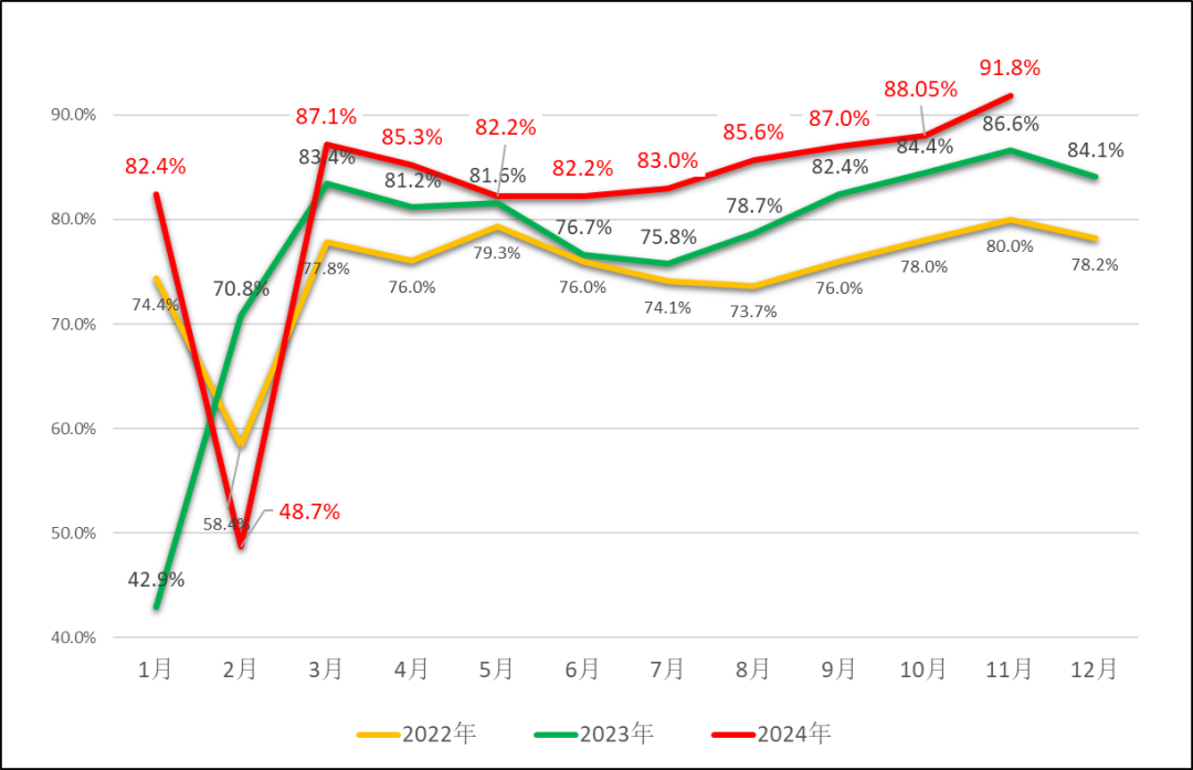 2024年1—11月,调研样本企业月度产能利用率保持高位运行,趋势向好,11月产能利用率均值达到今年最高点,为91.8%,环比增加3.8个百分点。