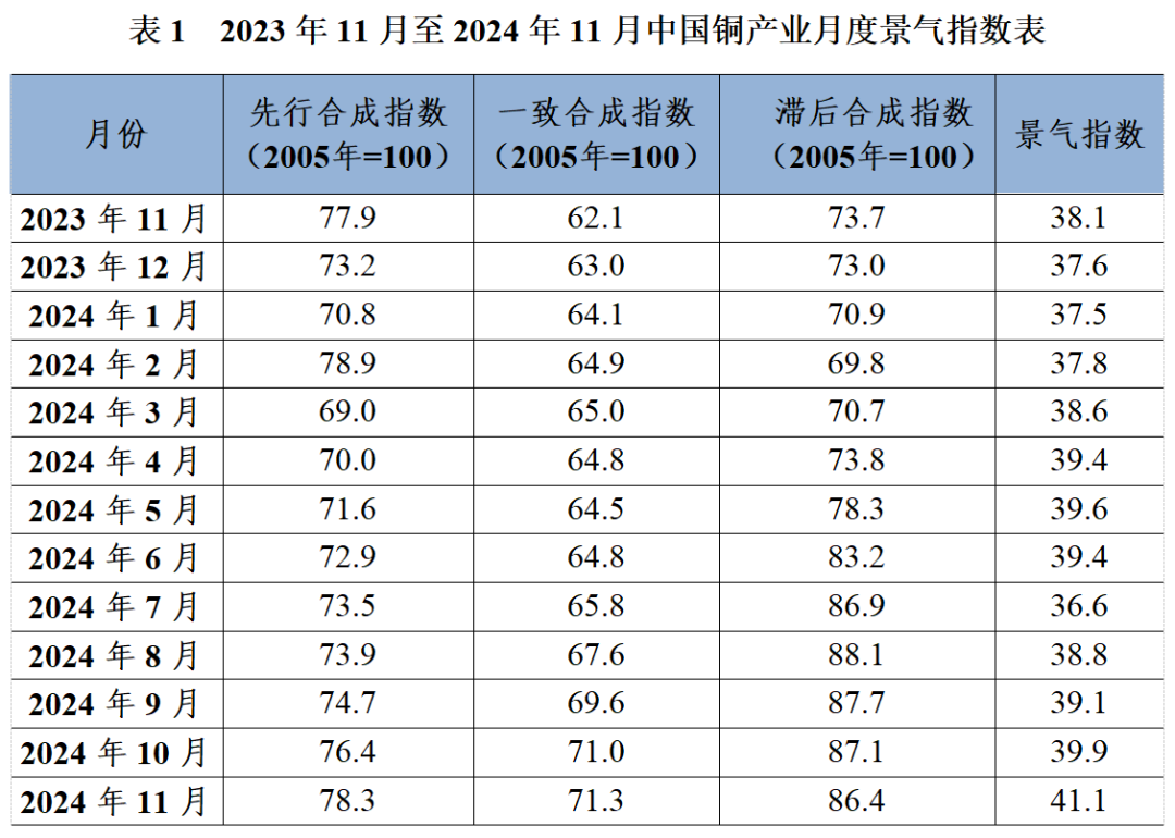 中国铜产业月度景气指数监测模型结果显示,2024年11月份,中国铜产业月度景气指数为41.1,较上月上升了1.2个百分点,继续保持在“正常”区间运行;先行合成指数为78.3,较上月上升了1.9个百分点。近13个月中国铜产业月度景气指数见表1。