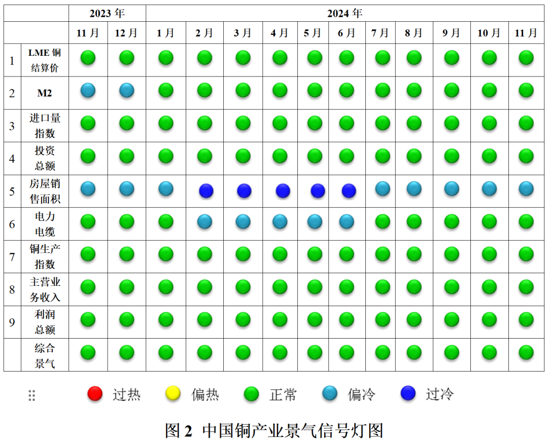 由图2中国铜产业景气信号灯可见,2024年11月份,在构成中国铜产业月度景气指数的9个指标中,只有商品房销售面积1个指标位于“偏冷”区间,其余8个指标均位于“正常”区间。