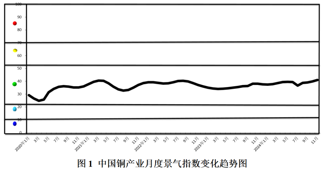 2024年11月份,中国铜产业月度景气指数为41.1,较上月回升了1.2个百分点,位于“正常”区间运行。中国铜产业月度景气指数变化趋势如图1所示。