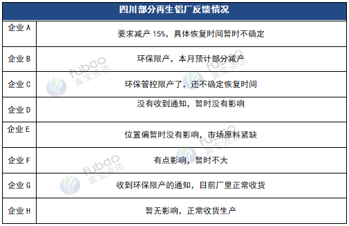 对此,富宝有色网针对四川省内部分再生铝厂做了调研回访,涉及年产能总量约120万吨。由调研反馈来看,各地均实施不同程度的管控措施。其中影响最大的是广安地区,当地规模以上的再生铝,收到了停产限产的通知,据企业反馈部分限产达到15%,但中小型再生铝厂多反馈影响较小,或是暂无影响;预计本月再生铝厂的开工及产量有不同程度的下滑。详情如下表所示: