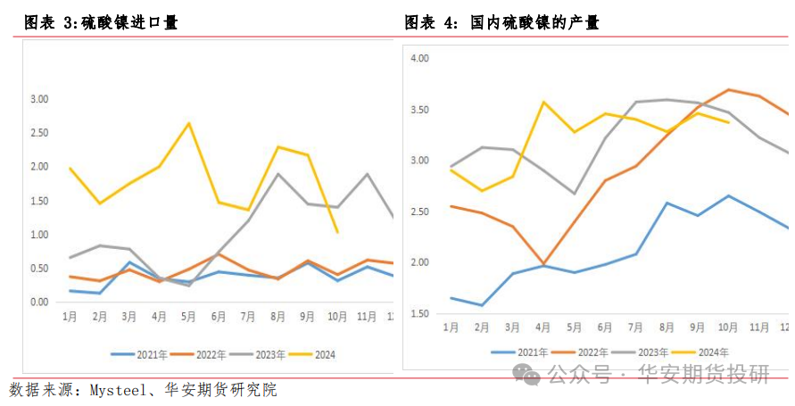 随着电动车辆和新能源技术需求的增长,硫酸镍作为动力电池的重要组成部分,产量和进口呈现稳步增长的趋势。本年度预计国内硫酸镍产量年产38.8万吨金属吨,基本与去年持平。于此同时进口却在放量增长,从23年的12.59万金属吨上涨至今年的18.14万金属吨。虽然新能源电池需求较大,但国内硫酸镍企业受到印尼在新能源电池领域的崛起,开工率始终保持在较低位置,全年整体维持在60%左右。表明国内市场的增量需求主要依靠海外进口而非国内企业自产来满足,未来随着印尼和菲律宾等国家的高压酸浸(HPAL)技术和产能提升,进口量仍将持续上涨。