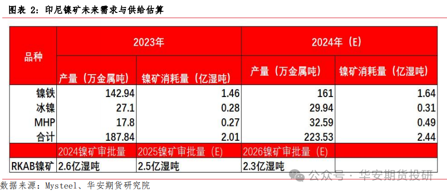 今年印尼政府的镍矿审批政策发生修改,从以前的每年一批变为为三年一批。上半年批准479家的镍企三年开采额度后,镍矿石开采额度达到每年2.4亿吨,加上下半年额外新增的0.2亿吨,24年总批准额度在2.6亿湿吨。需求上,随着硫酸镍、电积镍以及未来三元下游项目的陆续上线,预计2024年镍产量将达到217.88万镍金属吨,折算镍矿需求将有2.4亿湿吨。因此总体来看,本年度镍矿端过剩约0.2亿吨,镍矿端的价格支撑较弱。
