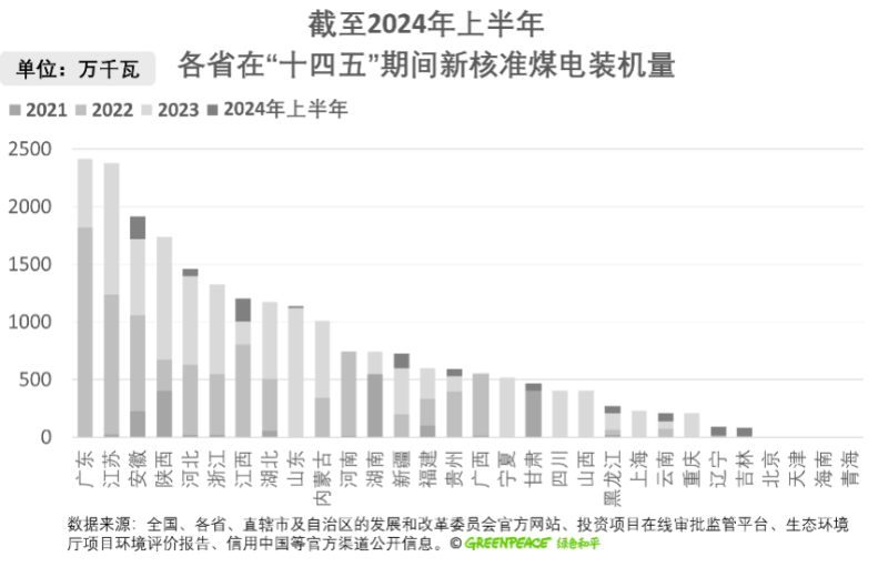 2024年8月,国际环保组织绿色和平发布根据公开信息统计了最新的煤电核准数据。截至2024年上半年,广东省在“十四五”期间新核准煤电装机数量雄踞全国第一。