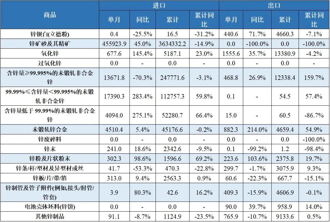 表1 2024年11月中国锌相关产品进出口情况(吨)