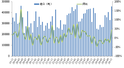 据最新海关数据披露,2024年11月中国进口锌精矿45.6万吨实物量,同比增加45.0%,环比增加37.7%;2024年1-11月累计进口锌精矿363.5万吨实物量,累计同比下降14.9%,降幅较1-10月收窄5个百分点。