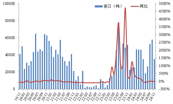 2024年11月锌合金进口量为4510吨,同比增加5.4%,环比下降25.6%;2024年1-11月,锌合金累计进口量4.5万吨,同比减少0.2%;累计出口量为4659吨,同比增加54.9%。整体看,2024年1-11月精锌及合金累计净进口量为44.3万吨,同比增加12.2%。