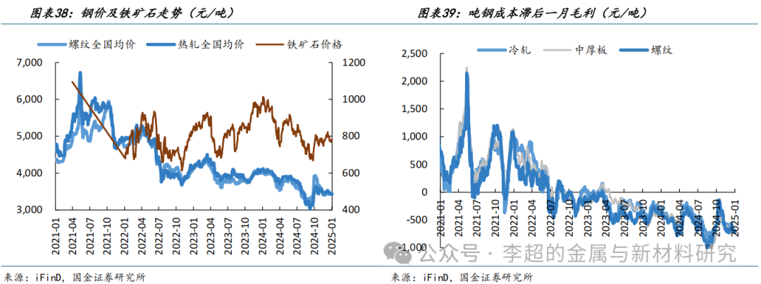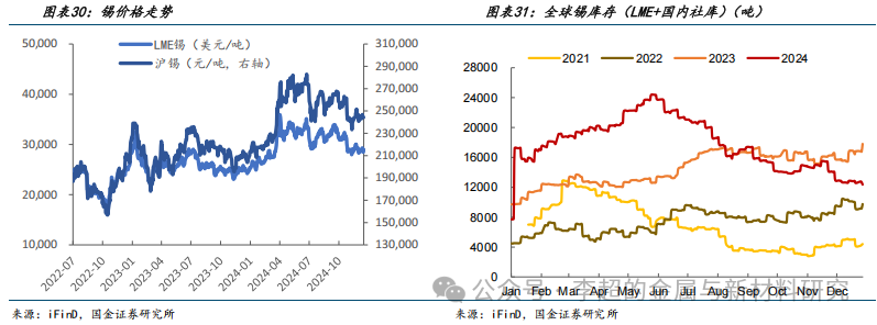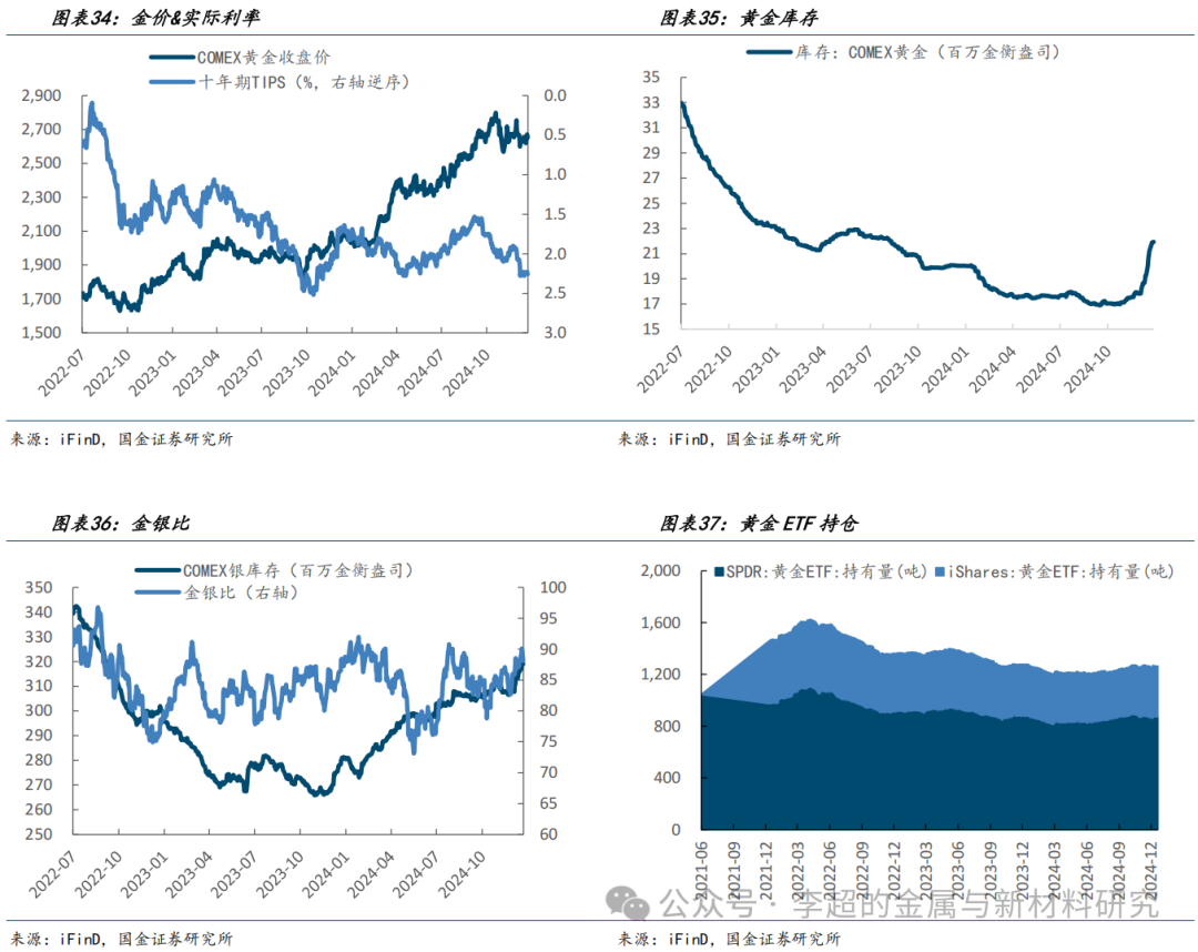 金:上周COMEX黄金价格+0.61%至2652.7美元/盎司,美债10年期TIPS下降2个基点至2.26%。SPDR黄金持仓减少1.44吨至871.08吨。上周金价有所上涨主因:(1)芝加哥12月PMI披露为36.9,大幅不及预期的43,美债收益率大跌;(2)地缘政治风险加剧,拜登要求国防部继续向乌克兰增援武器,以色列与哈马斯的停火谈判最近几天陷入僵局,俄罗斯停止通过乌克兰向欧洲供应天然气;(3)OPEC+推迟增产计划,油价大幅上涨,叠加特朗普政府即将就任,市场通胀预期再次提高。周五晚间公布的美国12月ISM制造业PMI录得49.3,超市场预期和前值,金价略有回调。在此前我们的两阶段6因素模型里,若仅在实际利率框架中,考虑到25年降息及市场中性利率水平,预计金价运行中枢为2600-2700美元/盎司,特朗普政府上任后美国通胀和通胀预期将有所抬升,压降短端实际利率水平,有望提振金价,而下半年随着相关财政政策的执行,预计赤字率或有超预期抬升,基于信用分析框架,金价有望冲击3000美元大关。目前黄金股估值普遍回到历史相对低位,而金价高位运行,预计黄金股相对收益将较为明显。建议关注山东黄金、中金黄金、山金国际、湖南黄金等标的。