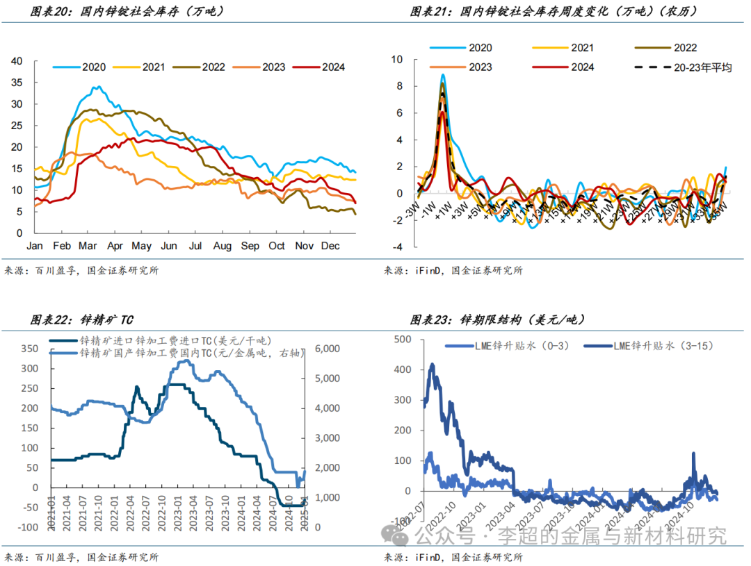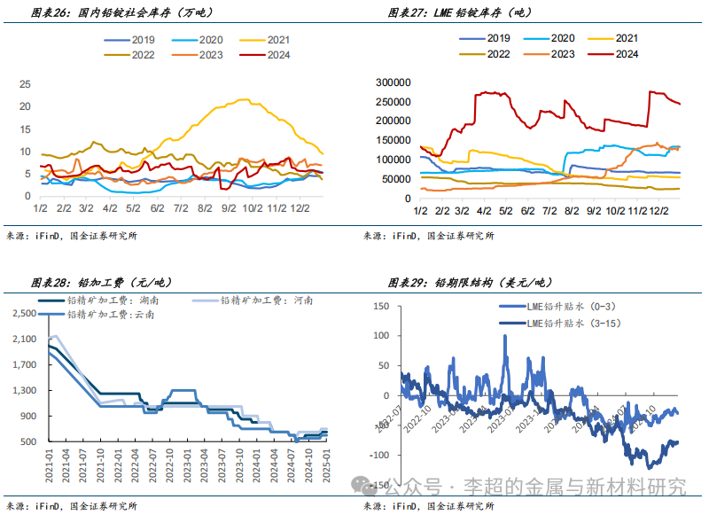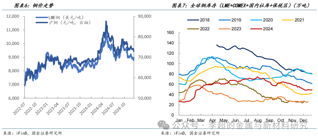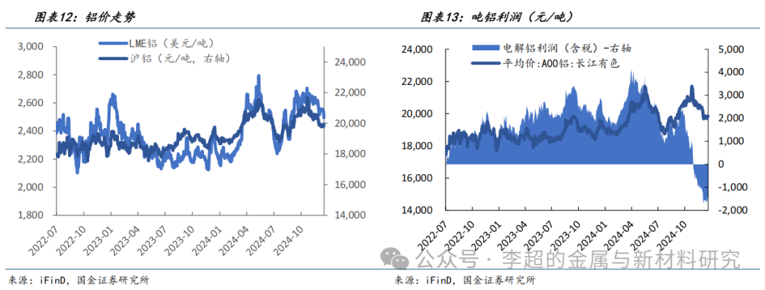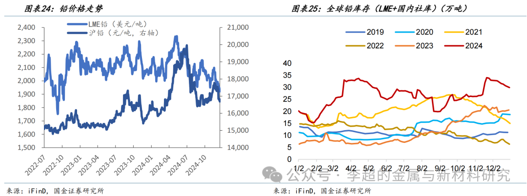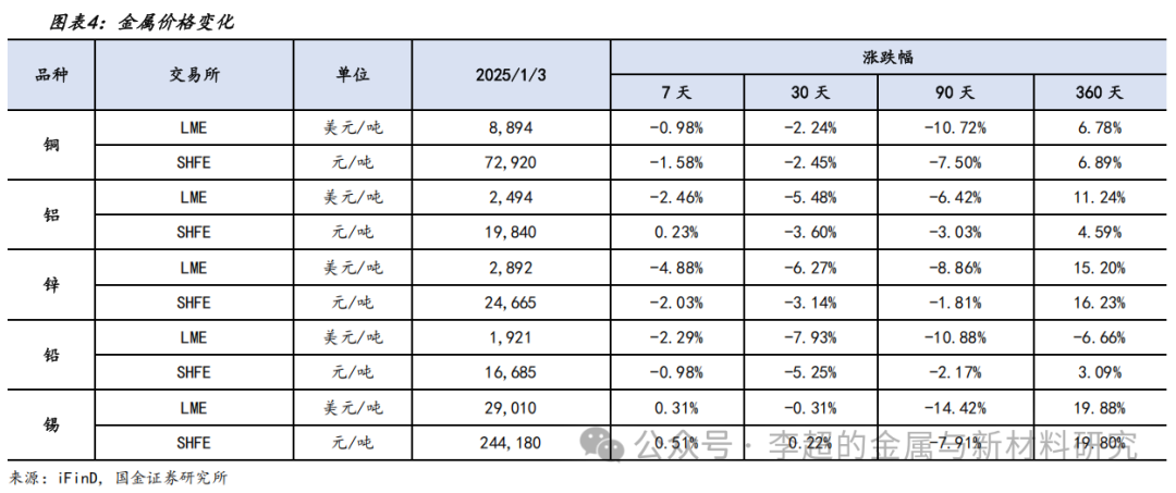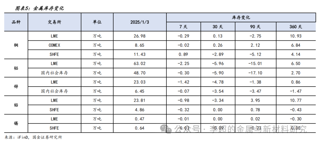 铝:上周LME铝-2.46%至2494美元/吨,沪铝价+0.23%至1.98万元/吨。全球铝去库1.29万吨至134.17万吨,其中LME去库2.25万吨至63.02万吨,国内铝锭+铝棒去库0.96万吨至71.15万吨。供应端,矿端供给受限,几内亚某大型铝土矿矿山近日受政局变动影响,部分陆运发运受限;电解铝方面,据SMM,2024年12月国内电解铝产量同比增长4.13%,2024年国内电解铝厂产量累计同比增长3.89%。成本端,周内有所上升,截止上周四,国内电解铝即时完全平均成本约21,490元/吨,较上周四上涨65元/吨,预计后期将有所下降。需求端,据SMM,上周铝下游开工率60.4%,较上周跌0.8个百分点。随淡季深入,下游将逐渐进入春节假期节奏,当前铝加工行业开工率节节下滑,部分铝加工厂临近放假,预计后续需求或将再度走弱。在产能红线背景下,25年国内电解铝有望迎来产量达峰,同比增速显著下滑,而需求端增速基于新能源车、特高压以及光伏等产业带动,预计依然维持稳健增长,国内电解铝供需缺口将在25年显著扩大。预计北美加征关税对铝需求较为有限,即便在加征关税的情况下,25年国内供需依然存在缺口,而一旦加税不及预期或国内政策执行力度超预期,吨铝利润有望进一步扩大。稳定利润及现金流有望带来铝板块估值抬升。建议关注中国铝业、天山铝业、云铝股份、神火股份等标的。