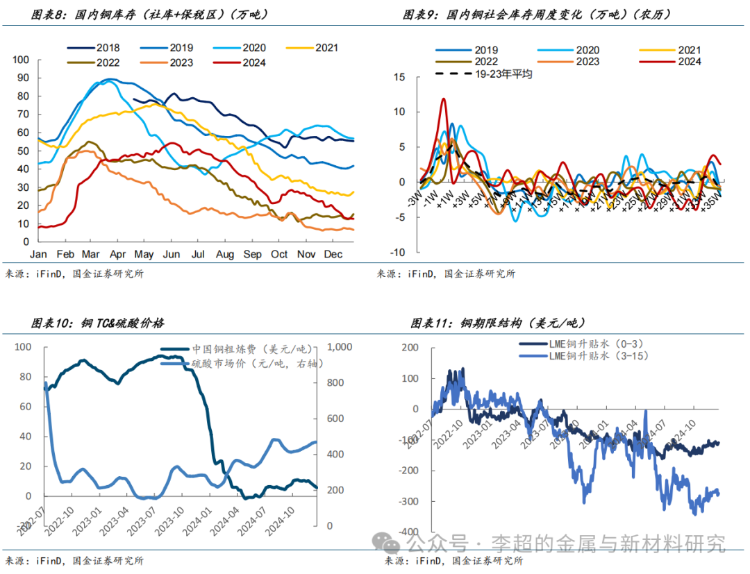 铜:上周LME铜价-0.98%至8894美元/吨,沪铜价-1.58%至7.29万元/吨。全球铜累库0.27万吨至48.95万吨,其中LME+COMEX去库0.32万吨至35.63万吨,国内社库+保税区累库0.59万吨至13.32吨。供应端,据文华财经,智利11月铜产量为48.85万吨,同比增加9.8%,但仍受矿石品位下降和新项目审批程序复杂的挑战。再生铜原料市场仍陷供应短缺困境,虽2024年1-11月,再生铜原料进口量累计同比增加13.76%,但SMM预计2025年其将呈现下滑趋势。中色国际与江西铜业确定2025年CIF进口粗铜RC基准为95美元/吨,较2024年减少21美元/吨。冶炼端,基本加工精炼费创历史新低,废铜市场趋紧,精炼铜增长有限。CSPT小组敲定2025年一季度现货铜精矿采购指导加工费为25美元/吨,环比-10美元/吨。消费端,据SMM,上周精铜杆开工率超预期下滑至66.43%,环比下滑8.49个百分点,主因多数企业年末资金回笼,下游企业下单及提货节奏放缓;上周铜线缆开工率77.9%,环比下降4.42个百分点,主因年尾市场采购积极性走弱以及铜价大幅下跌,2025年订单无明显释放。预计25年全球铜矿增速较24年有所增长,但在冶炼端投产预期下依然偏紧,而冷料端的限制或将对冶炼端投放形成掣肘。预计北美加征关税对铜需求影响更多体现在终端间接出口领域,因此特朗普上台后宣布和执行加征关税时点或为铜矿股加仓的重要时点。