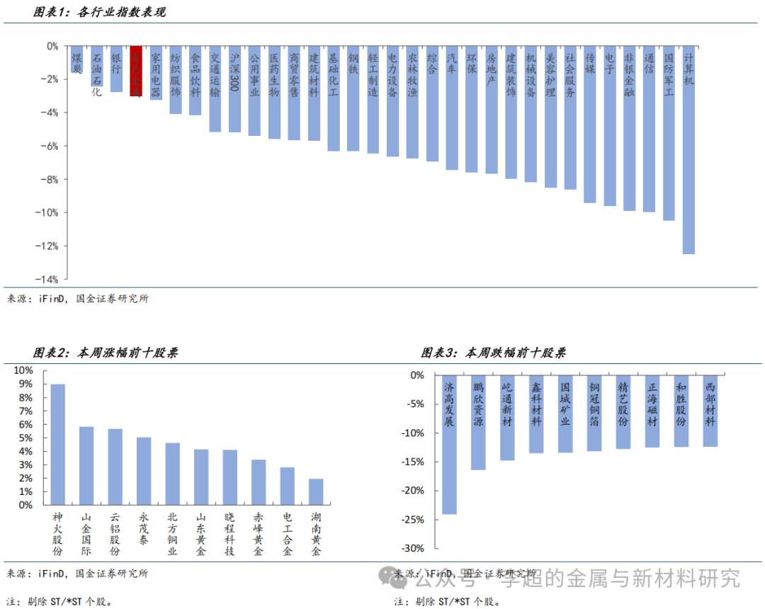 上周(2024.12.30-2025.1.3)A股全面下跌,沪深300指数跌5.17%,有色金属跌3.01%。神火股份、山金国际、云铝股份涨幅领先。