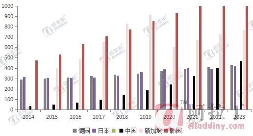 图 2 近十年主要国家工业机器人密度(台/万人)