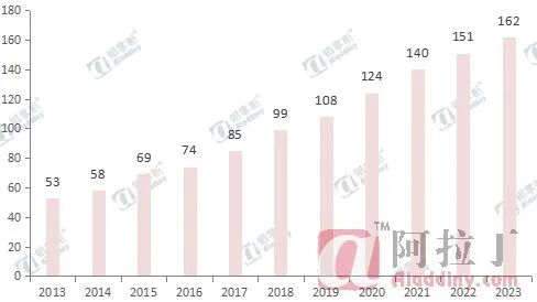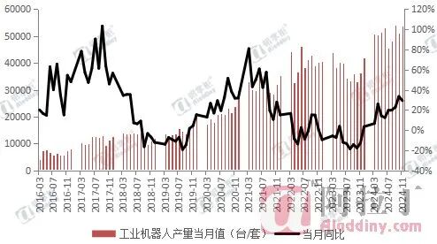 近年来,我国工业机器人产量大幅增长,并带动相应领域铝消费实现快速增长,阿拉丁(ALD)铝消费统计数据显示,2024年1-11月,工业机器人铝消费量约为14.67万吨,同比增加37.68%。
