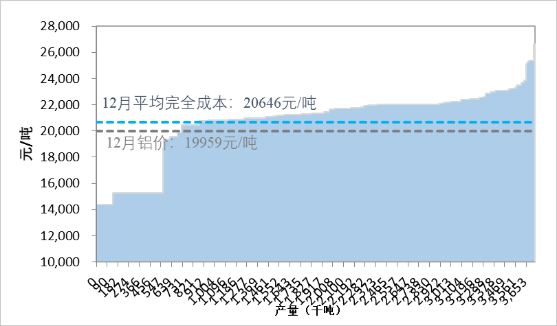 当月,在成本增加的同时,电解铝价格震荡下跌,行业利润严重收缩。以12月份沪铝连续合约均价19959元/吨计算,当月平均亏损687元/吨,为近三年来月度首次亏损,全行业亏损面显著扩大。安泰科估计12月份中国电解铝产量为373.4万吨,其中亏损产量占比高达约80%。