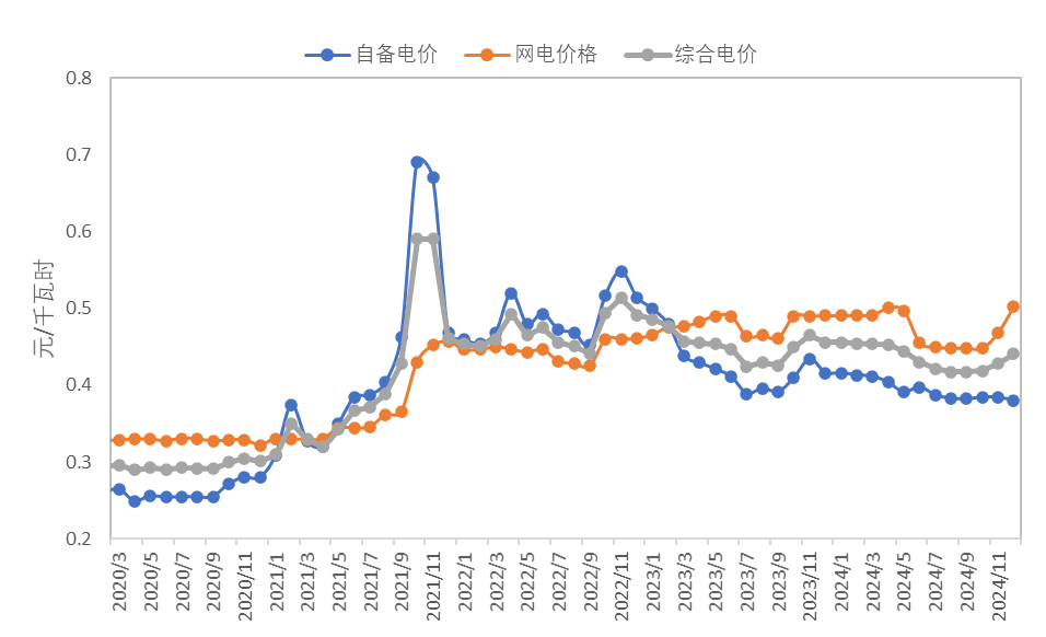 用电成本抬升。成本测算期内,煤炭价格稳中有降,铝厂自备电价小幅下行;网电方面,水电资源丰富地区进入枯水期,多个省/区网电价格明显上涨,尤其12月份以来,以四川为代表的部分地区电价大幅攀升,导致相关企业电解铝成本显著增加。根据安泰科统计,12月中国电解铝行业加权自备电价格为0.380元/千瓦时,环比下降0.004元/千瓦时;网电价格为0.502元/千瓦时,环比上涨0.034元/千瓦时;综合电价0.440元/千瓦时,环比上涨0.013元/千瓦时。